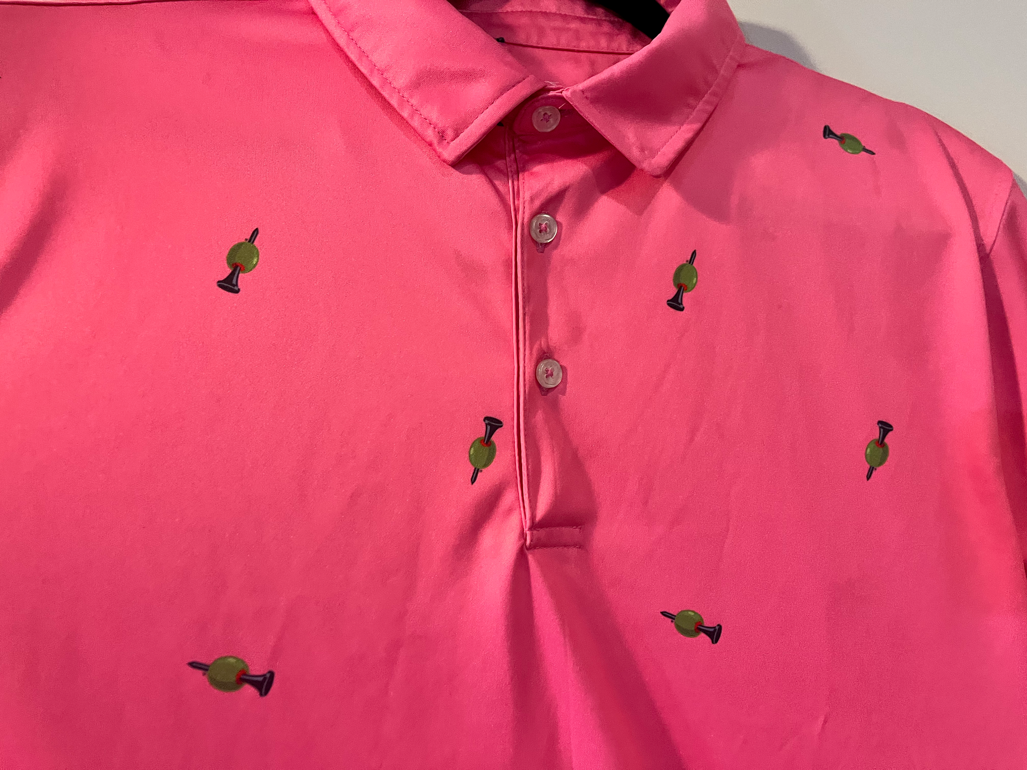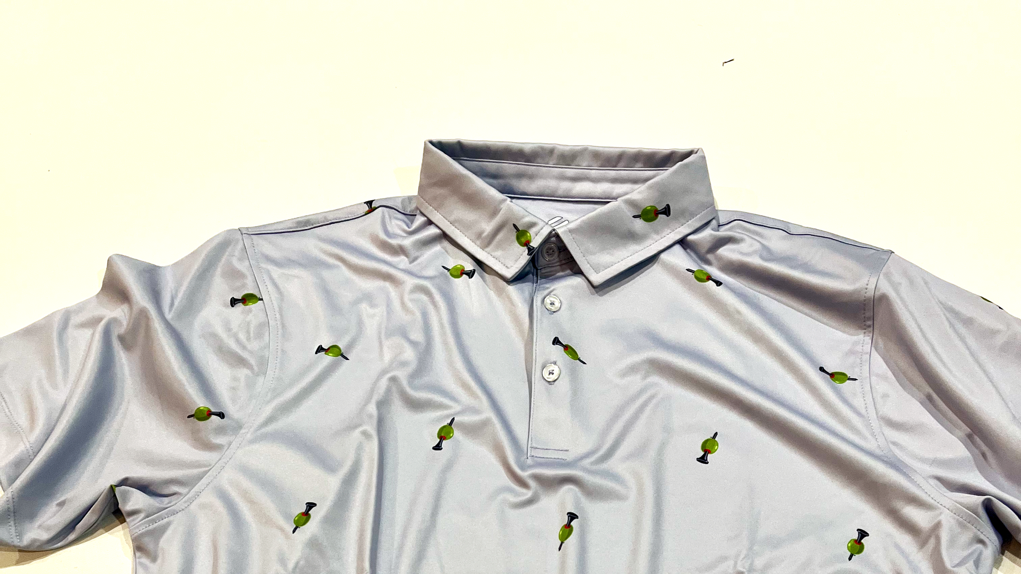 Our lightweight Tee & Olive performance polos are in. We like to think of it as the fabric of our lives, though it ain't cotton, rather a lightweight moisture-wicking poly with our killer logo printed on the fabric. It's a pretty darn cool golf shirt.